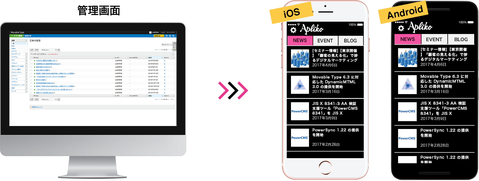 モバイルアプリパックは、Movable Type / PowerCMSで運用中のウェブサイトを10分でアプリ化できます。