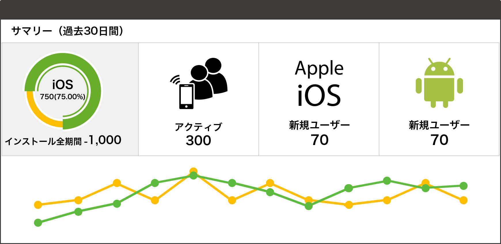 インストール数、アクティブなユーザー、ページビューなどをダッシュボードで可視化。